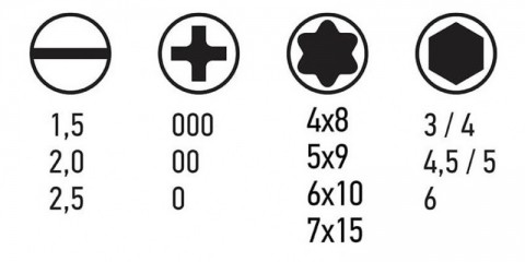 - Torx T4,T5 , T6 , T7 , T8 , T9 , T10 , T15