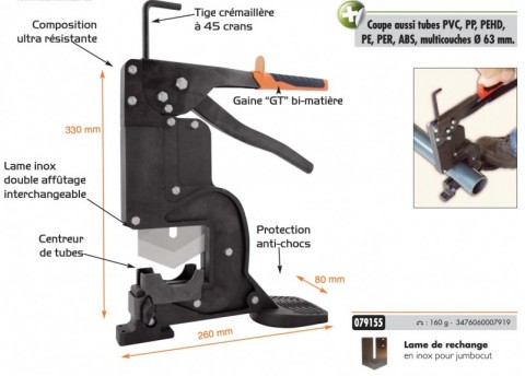 - Κόβει επισης PVC , PP . PHED , PE , PER ABS πλαστικους σωληνες με εξτρά εξάρτημα που συμπεριλαμβάνεται έως Φ63 διάμετρο