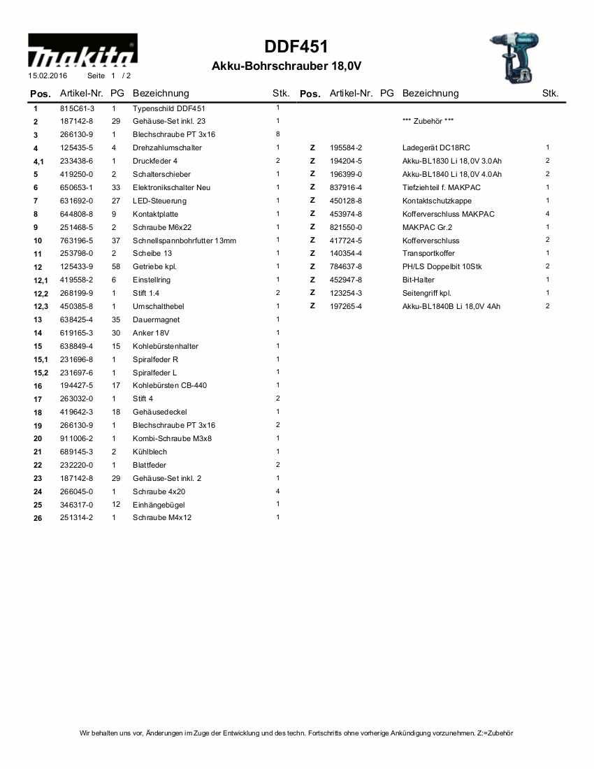 Ανταλλακτικά επαναφορτιζόμενου δραπανοκατσάβιδου MAKITA DDF451