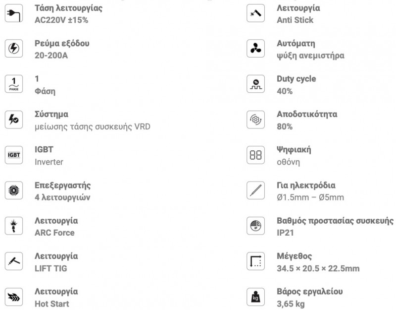 Ηλεκτροσυγκόλληση 200A, με επεξεργαστή 4 λειτουργιών: Ρύθμιση Amperes, Hot Start, ARC Force, 2 σε 1 ΜΜΑ & Lift TIG.