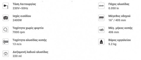 - Tαχύτητα Κοπής Αλυσίδας 13 m/s