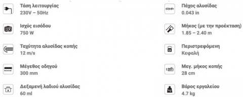 - Tαχύτητα αλυσίδας κοπής 12 m/s