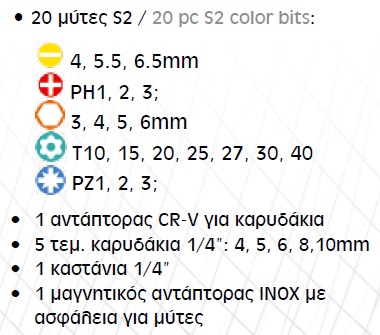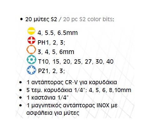- 20 τεμάχια μύτες από S2 πολυ σκληρό ατσάλι με χρώμα διαχωρισμού