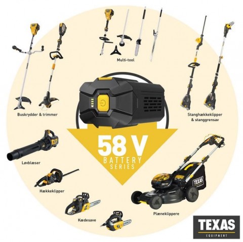 Η σειρά Texas 58V είναι μια πλήρης γραμμή προϊόντων για τον κήπο. Με την πλατφόρμα μπαταρίας 58V κερδίζετε έξτρα ισχύ, παρόμοια με εκείνη που προσφέρουν τα βενζινοκίνητα χορτοκοπτικά - πολυμηχανήματα. Ωστόσο απολαμβάνετε όλα τα πλεονεκτήματα των μηχανημάτων μπαταρίας, όπως το μικρό βάρος, τις μηδενικές εκπομπές ρύπων και το ελάχιστο επίπεδο δονήσεων και θορύβου με πολύ λιγότερη συντήρηση